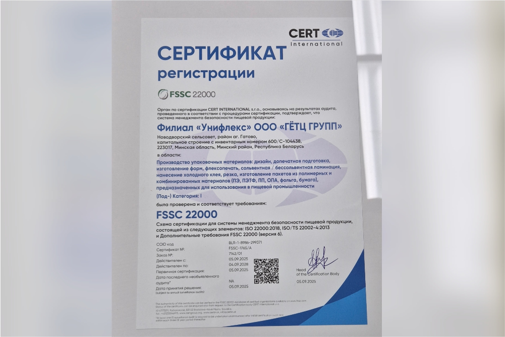 «Наличие международного сертификата FSSC 22000 укрепляет позиции предприятия как надежного поставщика для компаний пищевой индустрии и открывает новые возможности для экспорта», – отметил Алексей Пучило, заместитель директора по производственно-технологическим процессам «Унифлекс».